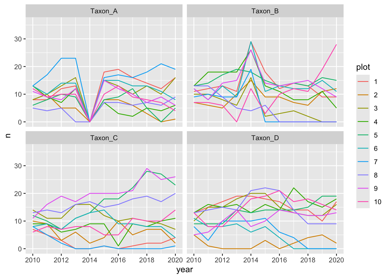 Notice how “Taxon_A” is absent from all plots in 2014 whereas “Taxon_B” has extremely high counts in the same year. Often this can signify inconsistent use of taxonomic names over time.