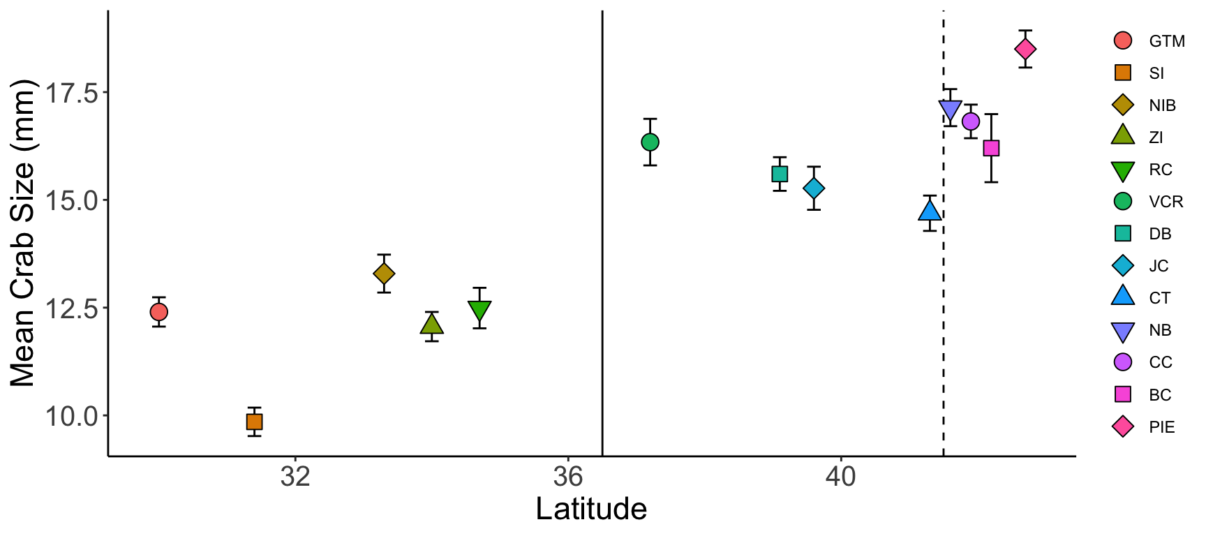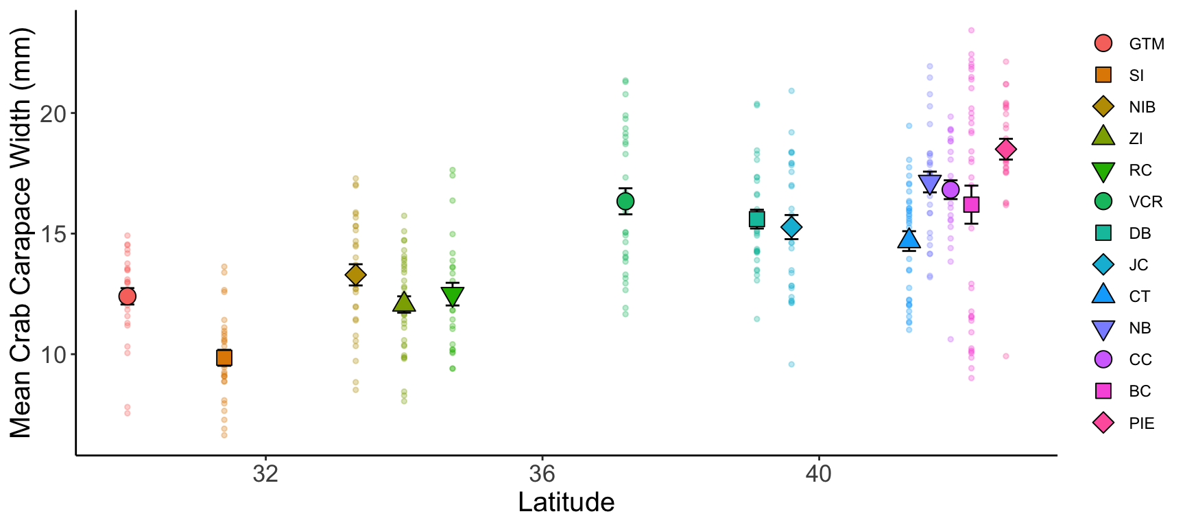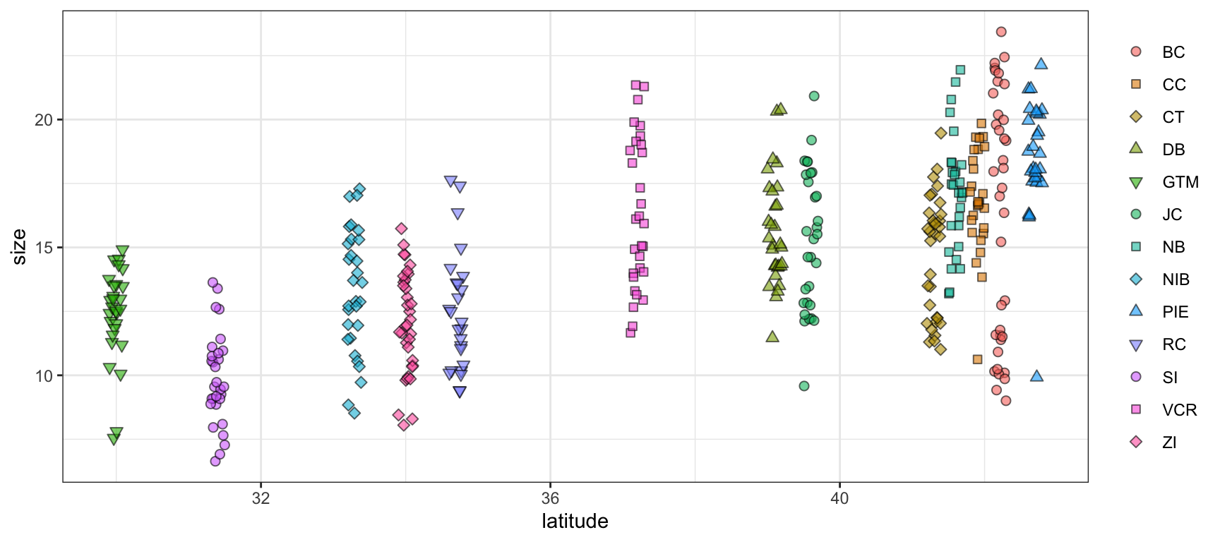 Let’s begin with a scatterplot of crab size on the Y-axis with latitude on the X. We’ll forgo doing anything to the theme elements at this point to focus on the other three elements.
