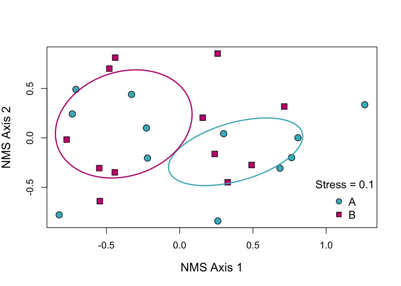 If the stress is less than 0.15 it is generally considered a good representation of the data. We can see that the ellipses do not overlap which indicates that the community composition of our two groups does seem to differ. We’d need to do real multivariate analysis if we wanted a p-value or AIC score to support that but as a visual tool this is still useful.