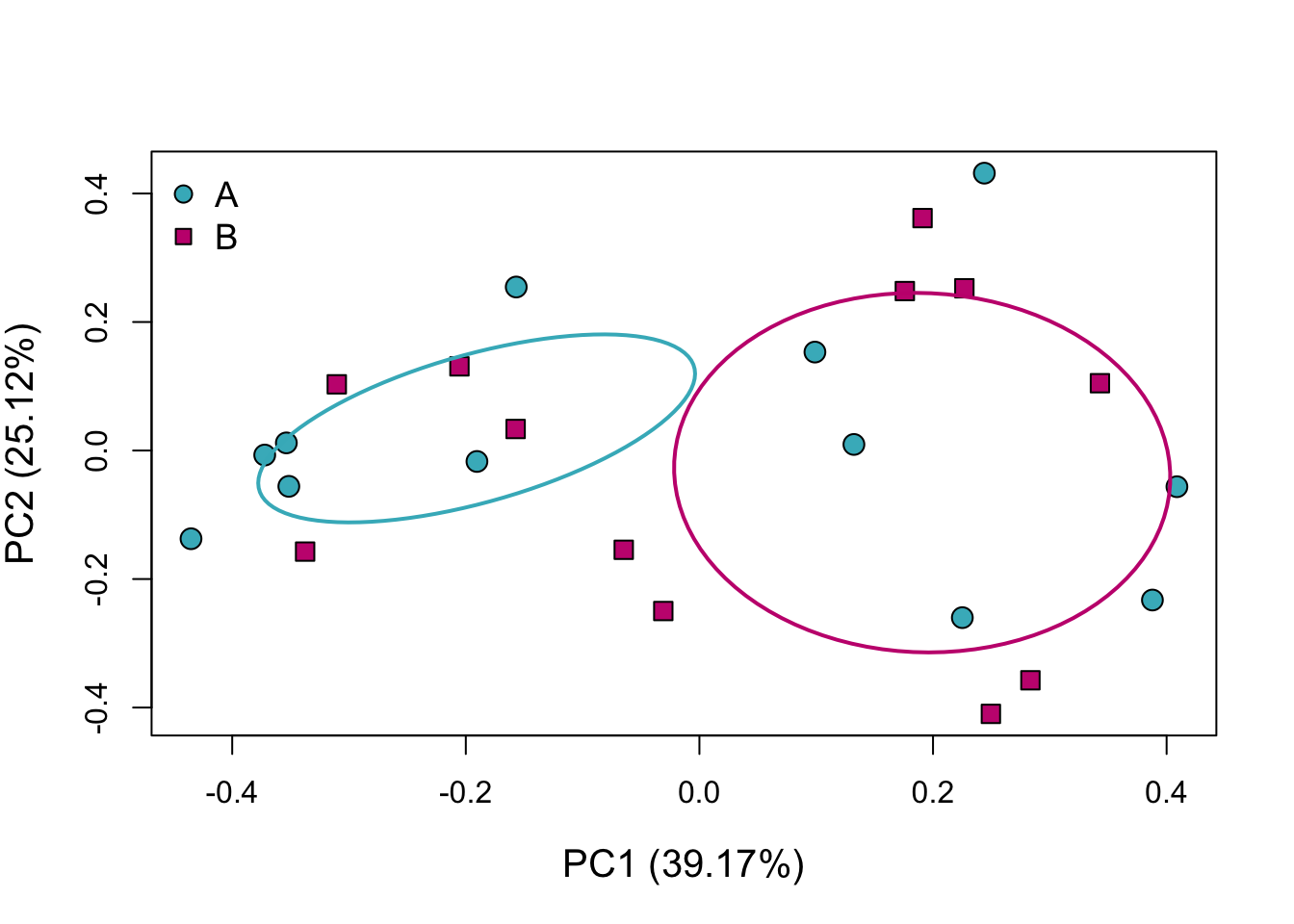 Two of the more common methods for metric ordination are Principal Components Analysis (PCA), and Principal Coordinates Analysis (PCoA / “metric multidimensional scaling”). The primary difference is that PCA works on the data directly while PCoA works on a distance matrix of the data. We’ll use PCoA in this example because it is closer analog to the non-metric ordination discussed in the other tab. If the holistic difference among groups is of interest, (rather than metric point-to-point comparisons), consider a non-metric ordination approach.