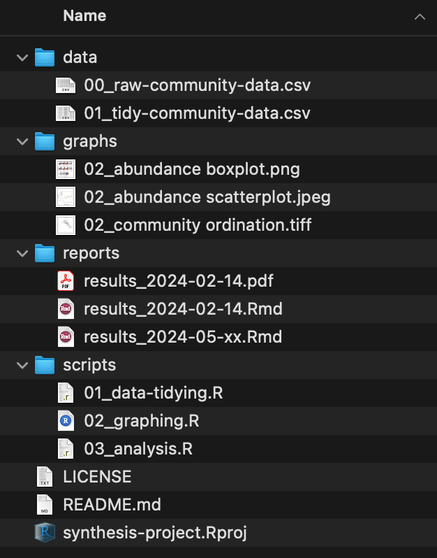 Note that how you define “project” may affect the number of folders you need! Some synthesis projects may separate data harmonization into its own project while for others that same effort might not warrant being considered as a separate project. Similarly, you may want to make a separate folder for each manuscript your group plans on writing so that the code for each paper is kept separate.