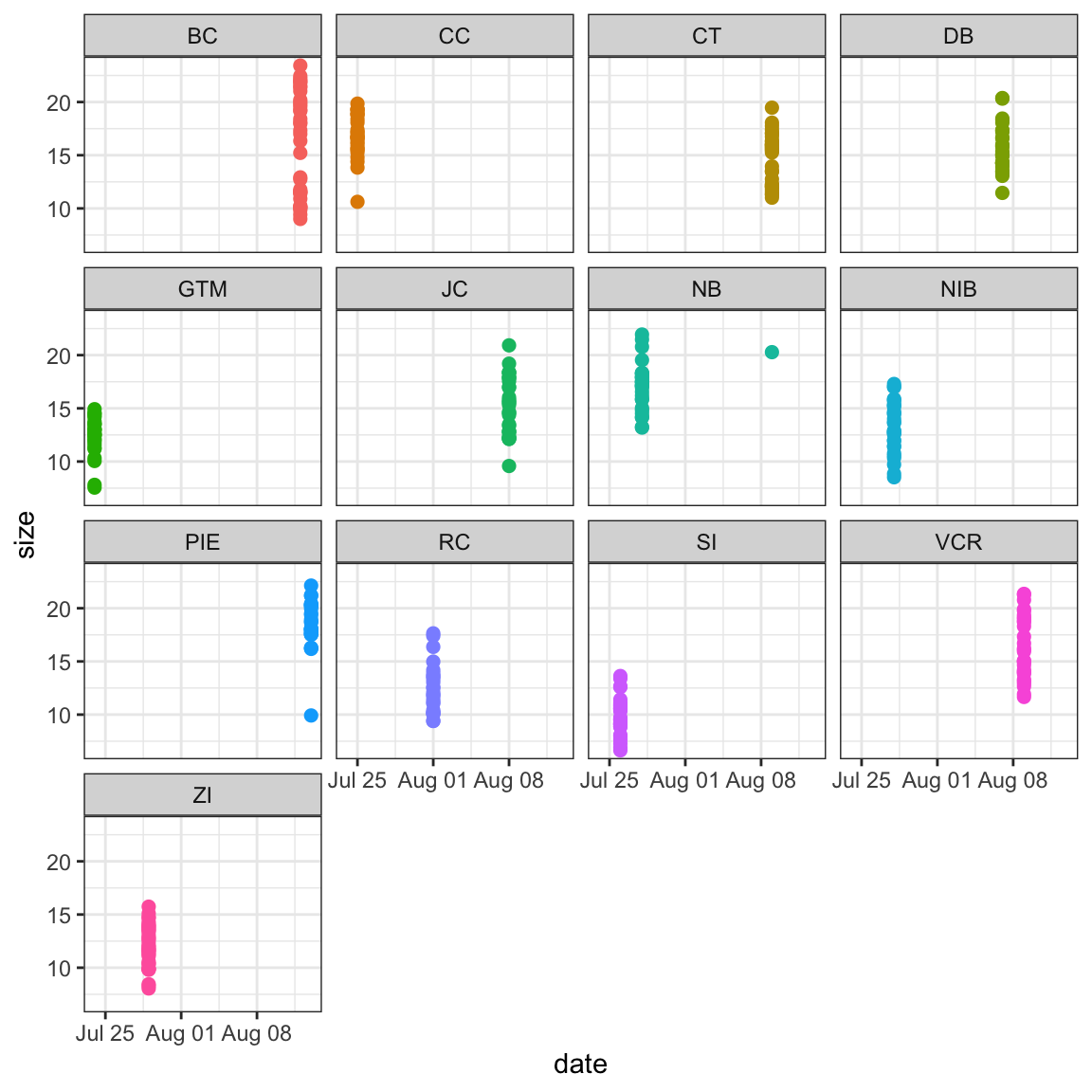 ggplot(pie_crab, aes(x = date, y = size, color = site))+geom_point(size =2) +facet_wrap(. ~ site) +theme_bw() +theme(legend.position ="none")