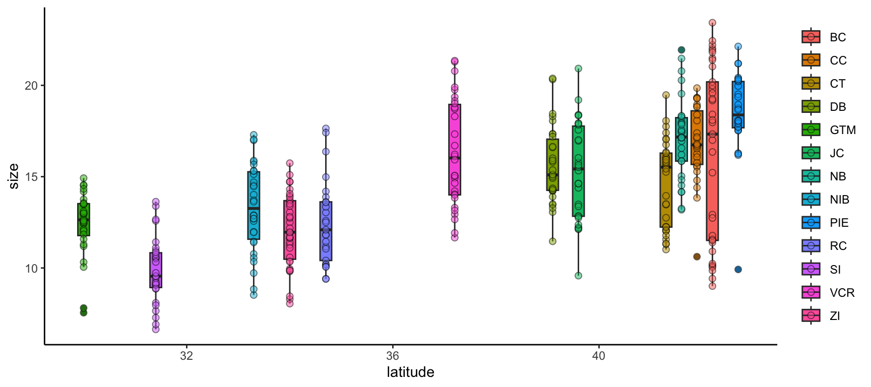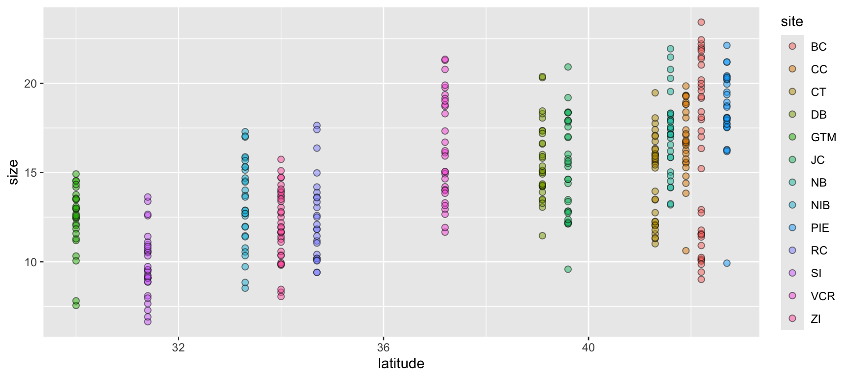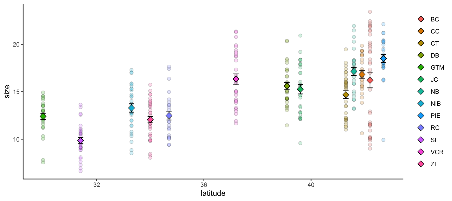 ggplot() +geom_point(pie_crab, mapping =aes(x = latitude, y = size, fill = site),pch =21, size =2, alpha =0.2) +geom_errorbar(crab_summary, mapping =aes(x = latitude,ymax = mean + std_error,ymin = mean - std_error),width =0.2) +geom_point(crab_summary, mapping =aes(x = latitude, y = mean, fill = site),pch =23, size =3) +theme(legend.title =element_blank(),panel.background =element_blank(),axis.line =element_line(color ="black"))
