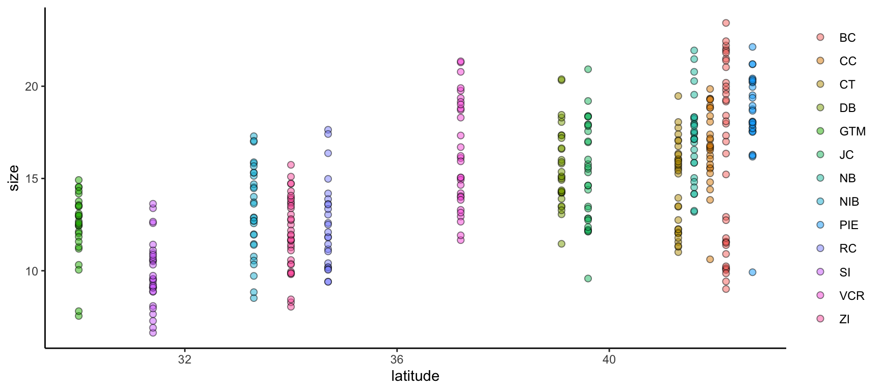 Let’s begin with a scatterplot of crab size on the Y-axis with latitude on the X. We’ll forgo doing anything to the theme elements at this point to focus on the other three elements.