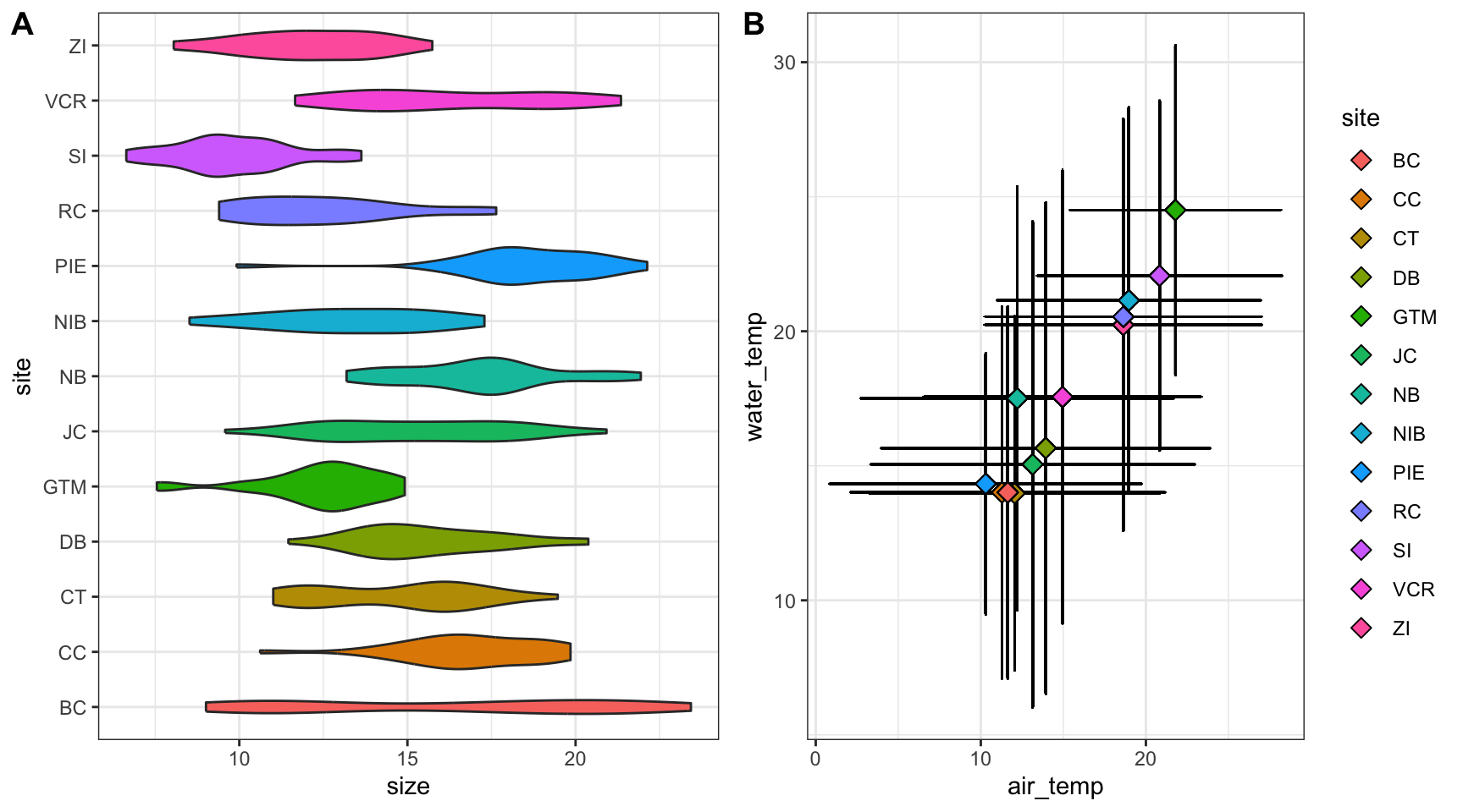 # Load a needed librarylibrary(cowplot)# Create the first graphcrab_p1 <-ggplot(pie_crab, aes(x = site, y = size, fill = site)) +geom_violin() +coord_flip() +theme_bw() +theme(legend.position ="none")# Create the secondcrab_p2 <-ggplot(pie_crab, aes(x = air_temp, y = water_temp)) +geom_errorbar(aes(ymax = water_temp + water_temp_sd, ymin = water_temp - water_temp_sd),width =0.1) +geom_errorbarh(aes(xmax = air_temp + air_temp_sd, xmin = air_temp - air_temp_sd),width =0.1) +geom_point(aes(fill = site), pch =23, size =3) +theme_bw()# Assemble into a plot gridcowplot::plot_grid(crab_p1, crab_p2, labels ="AUTO", nrow =1)