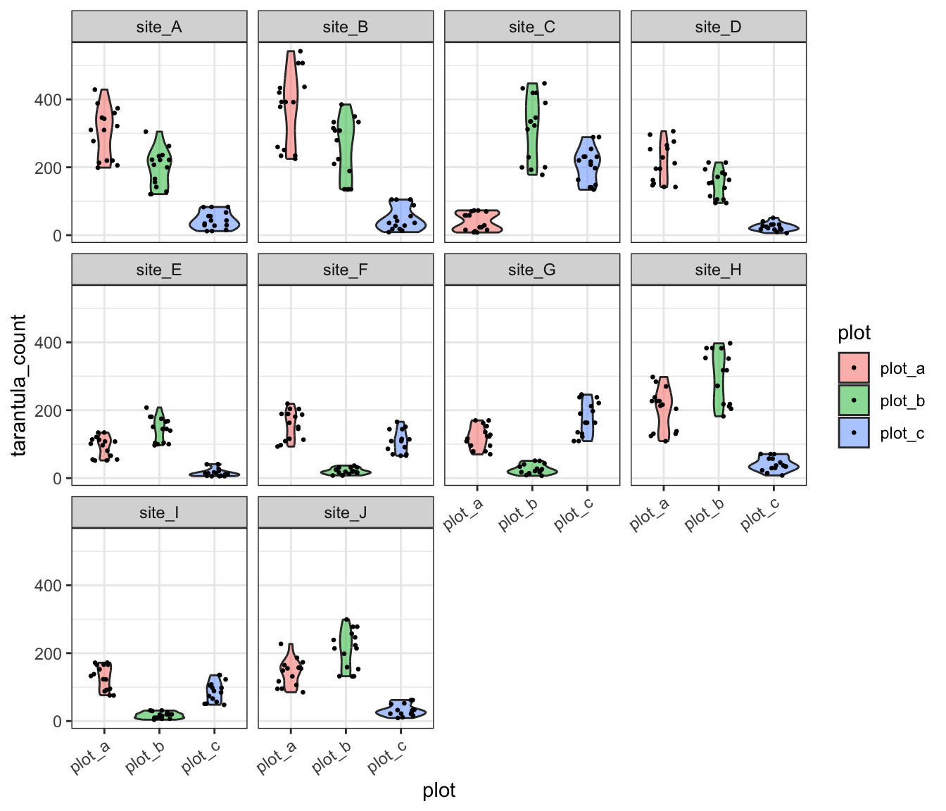 # Load the needed librarylibrary(ggplot2)# Make the graphggplot(tarantula_df, aes(y = tarantula_count, x = plot, fill = plot)) +geom_violin(alpha =0.5) +geom_jitter(width =0.25, size =0.5) +facet_wrap(site ~ .) +theme_bw() +theme(axis.text.x =element_text(angle =35, hjust =1))