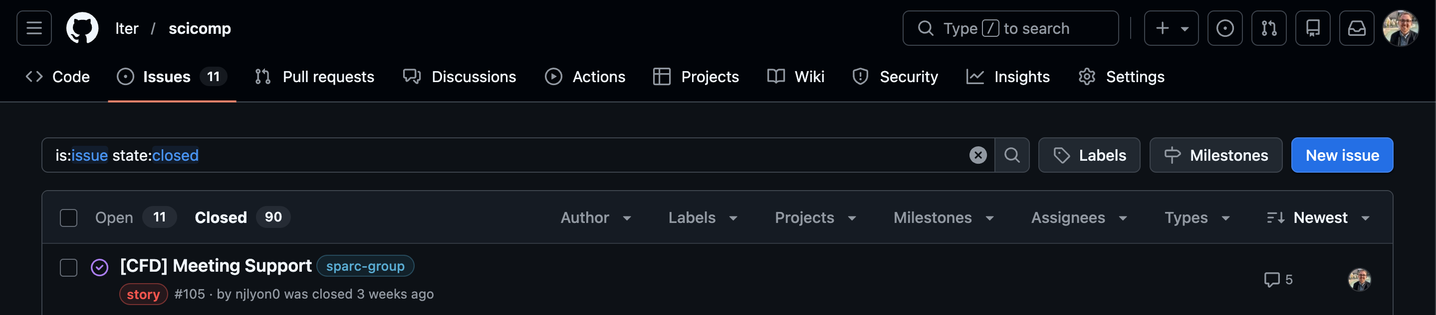 If we look just above the first issue we can see that 10 issues are “open” (i.e., active) and 90 are closed. By default only the open ones are displayed. Your group may not need that many issues so don’t worry too much about how many you’ve got!