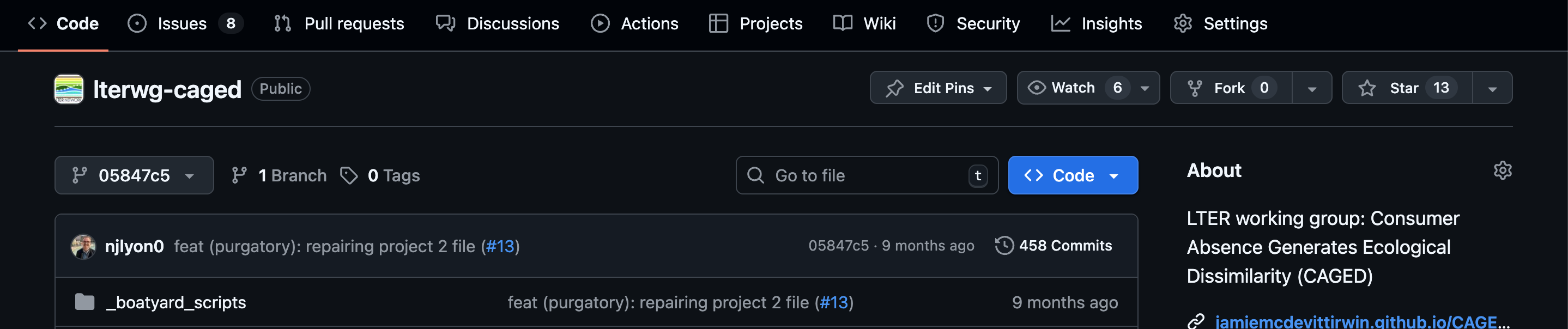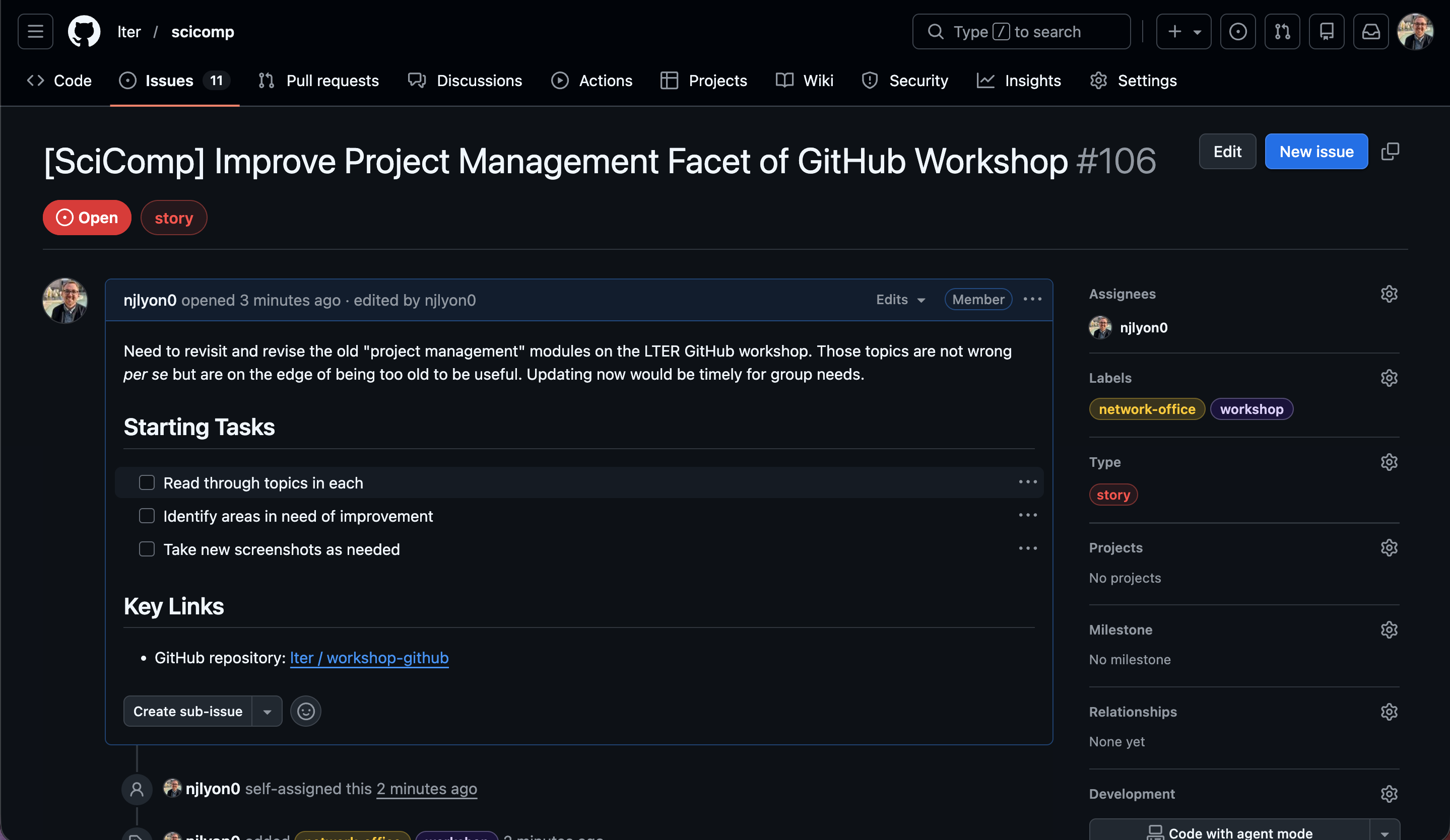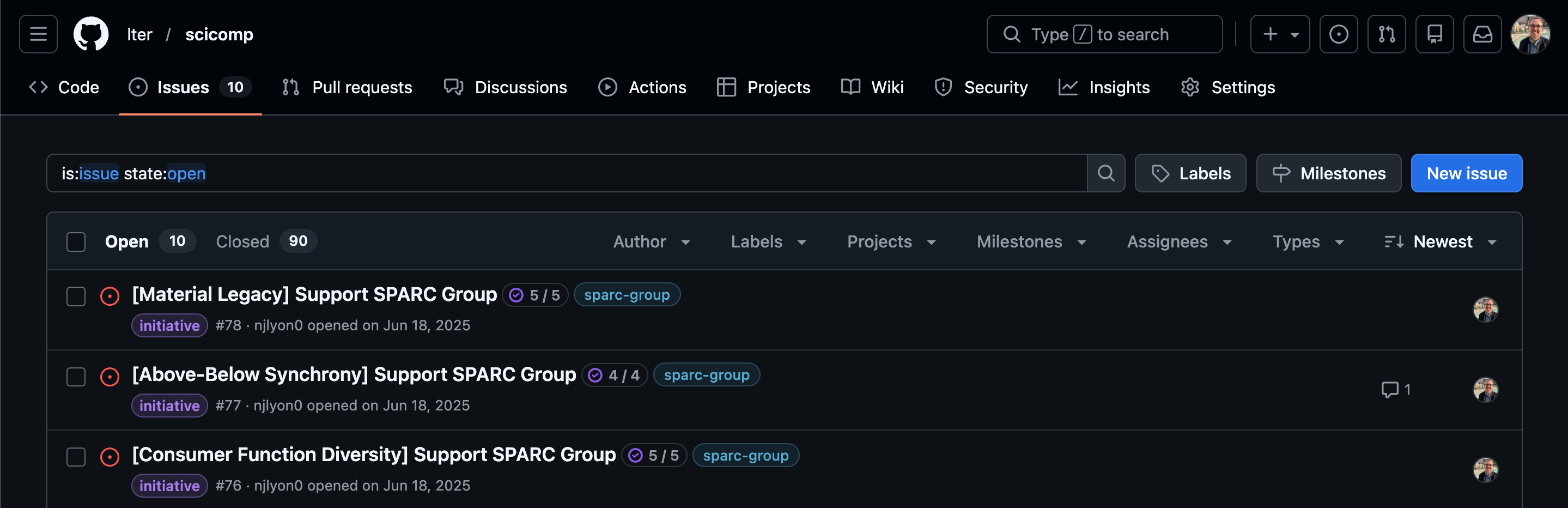 The next tab over is labeled “ Issue”, click that tab! You should now see the list of all issues in the repository. As we can see in the screen capture below, the most recent few issues (sorted to the top, just like commits), are focused on a cohort of LTER SPARC groups.