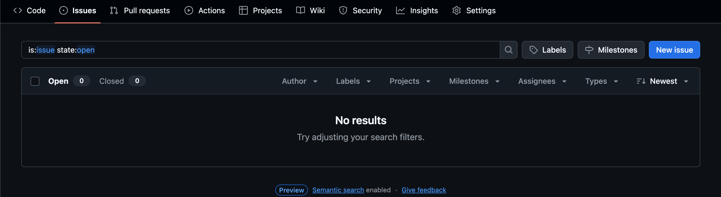If you click into the ‘Issues’ tab of a repository that doesn’t have any, you’ll get a screen like the following screen capture. Note that other than the absence of issues, the screen looks the same as when there are issues (i.e., the same buttons and search/filter fields are still available).