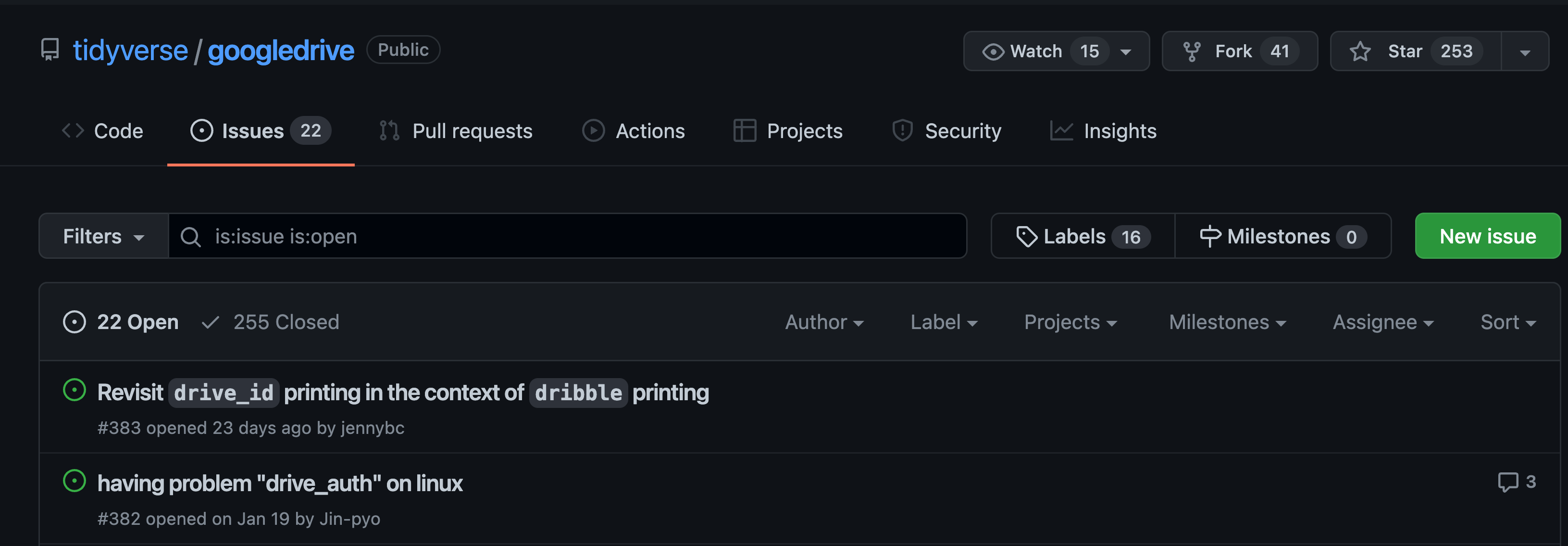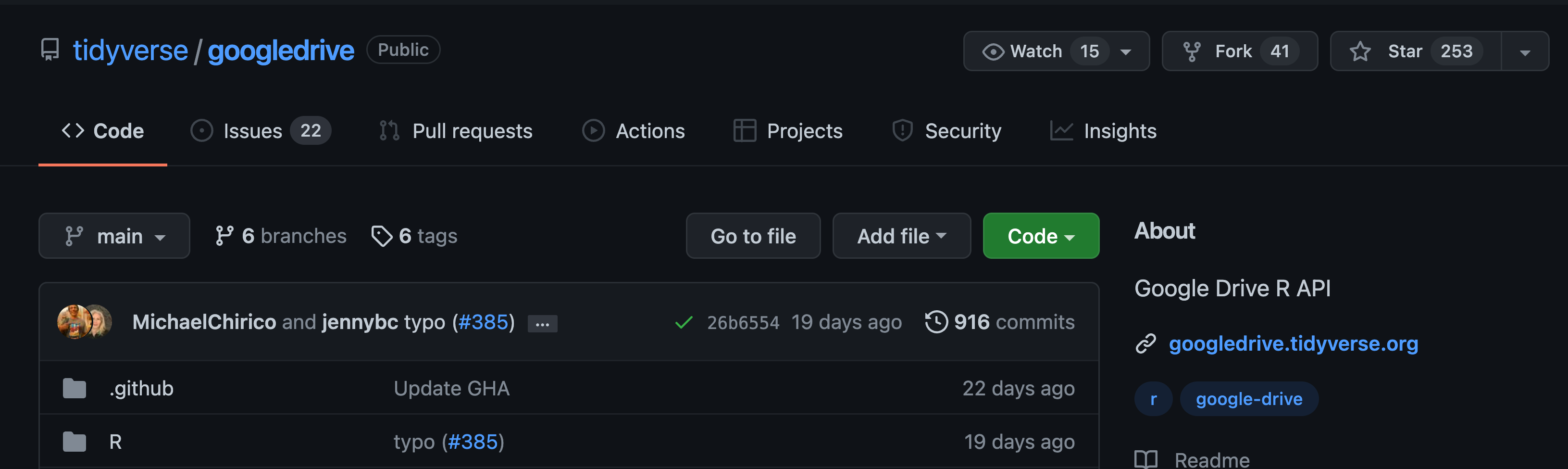 Below is the GitHub landing page for the googldrive package and you can see that next to the underlined “Code” tab is an “Issues” tab with a gray circle with the number 22 in it. This number notifies us that as of this screen capture, there were twenty two open issues on this package’s GitHub repository.