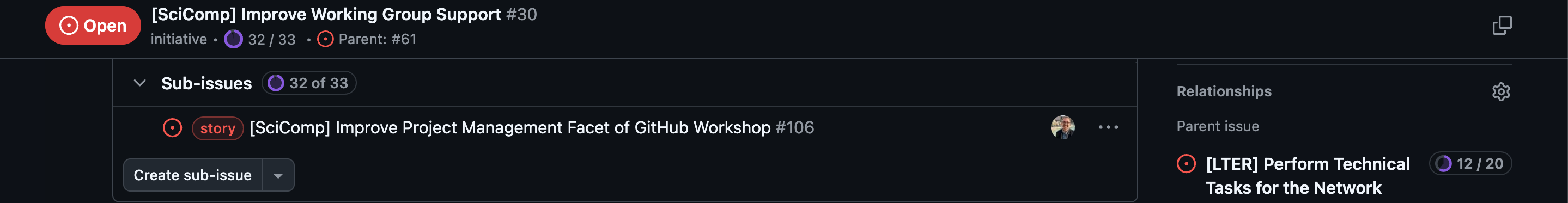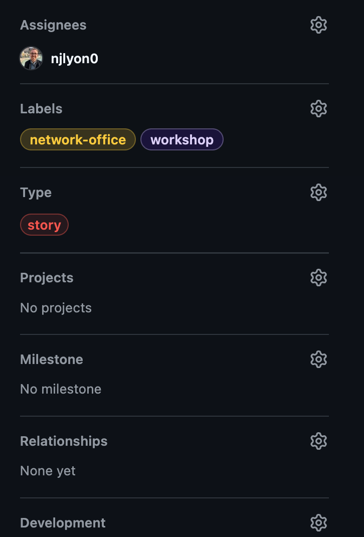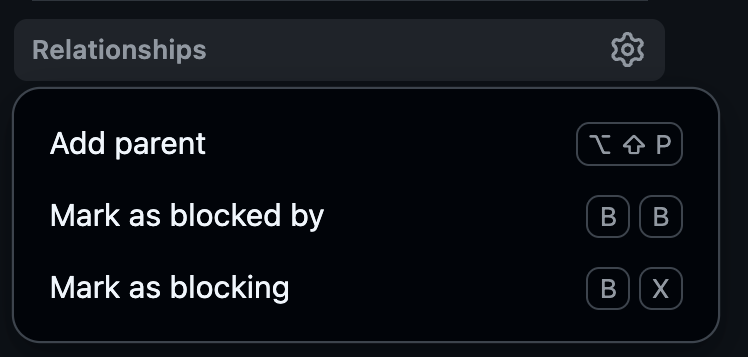 Whatever the specifics, you can formally enshrine this in GitHub by editing a piece of the issue’s metadata in the right sidebar beneath most of the other issue metadata elements. The “Relationships” piece is towards the bottom of the metadata sidebar (just beneath “Milestone”).
