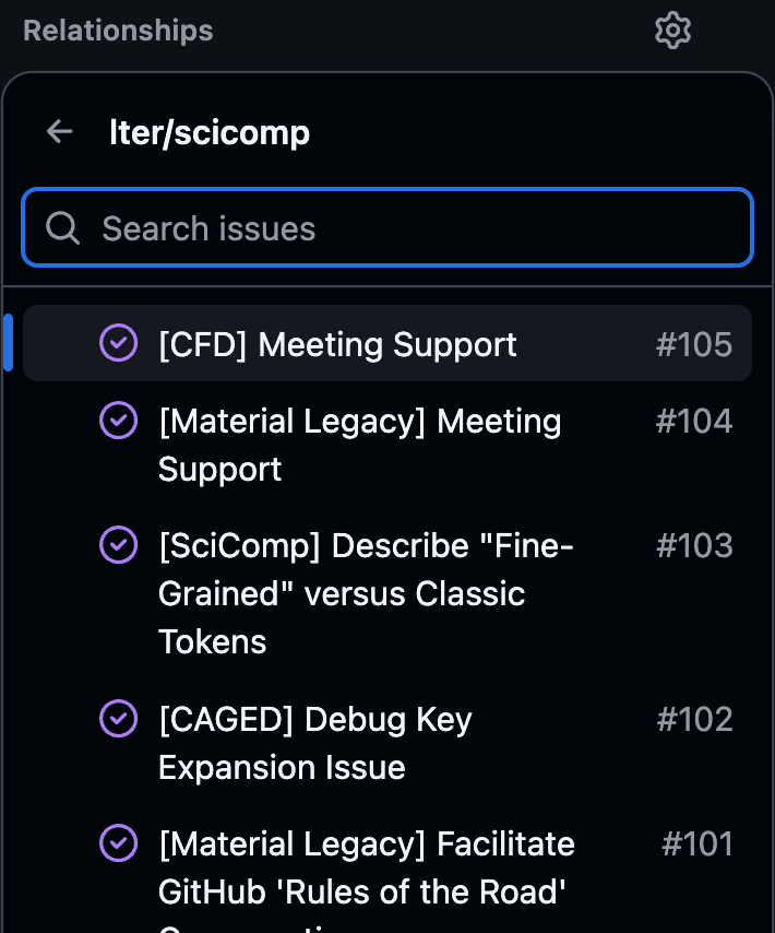 Regardless of the type of relationship you pick, you will now be in a dropdown menu with all the issue in this repository as options to be added as in-relationship with your current issue. You can either scroll through this list or type words that are in the title of the issue with which you want to connect your current one.