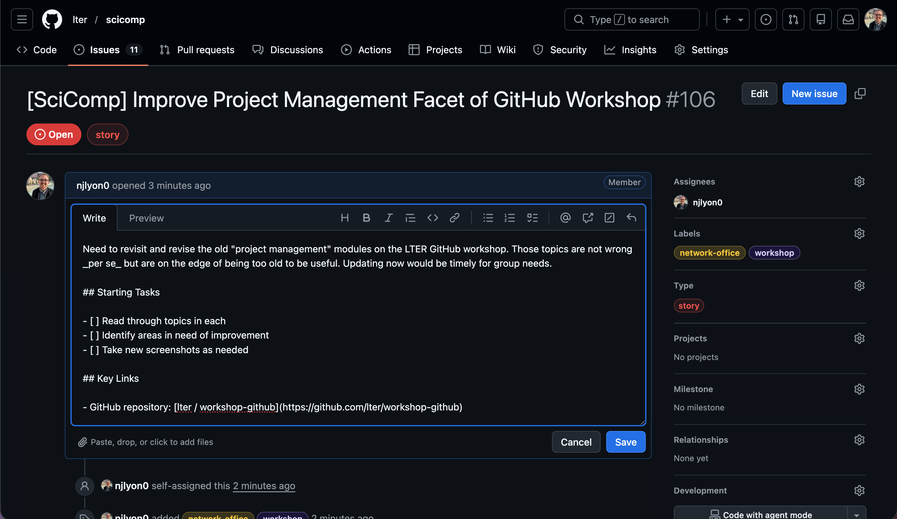 Once you’re happy with the metadata, we can edit the first comment. “Edit” not “make” because the first comment is actually the field below the title that we left blank when we opened the issue initially. To edit that comment, click the ellipsis (…) in the top right corner of the first comment and select the “ Edit” option. Note that GitHub issues accept Markdown syntax so any tips or tricks you’ve picked up in styling the plain text of RMarkdown or Quarto files should also apply to beautifying your issue.